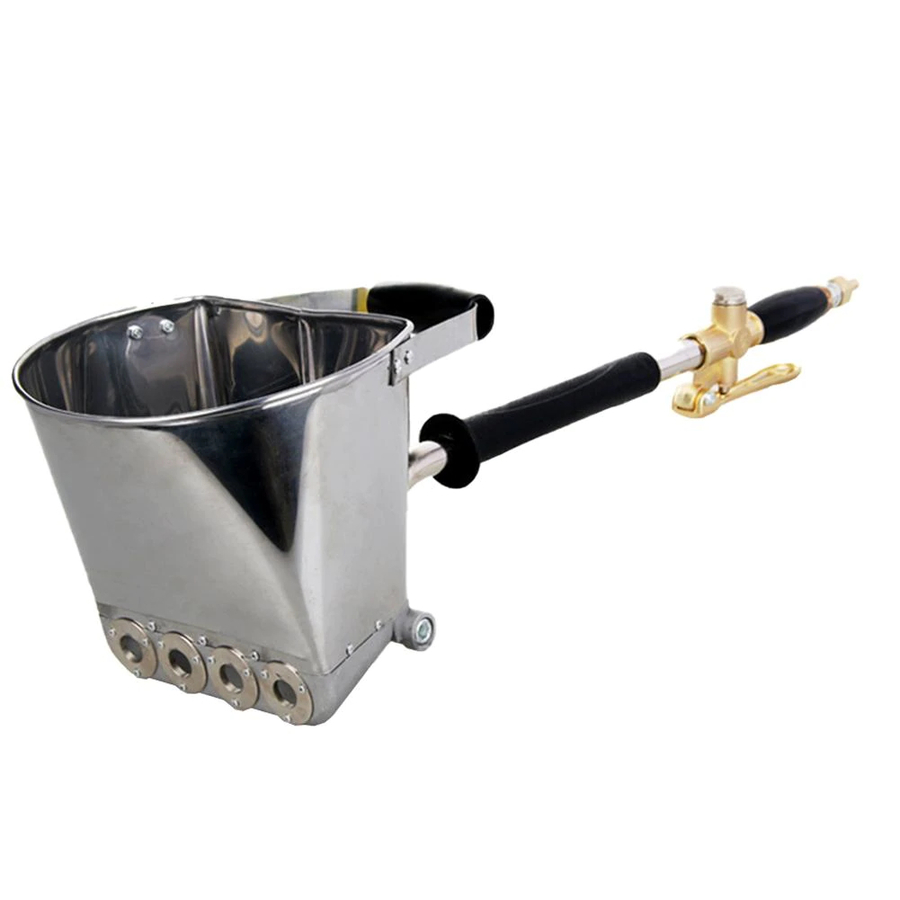 Готовый раствор зачерпывается хоппер-ковшом из емкости, ковш подносится к стене на расстояние 5-25 см. Нажатием рукоятки воздух из компрессора подается через шланг на хоппер-ковш и под высоким давлением происходит распыление раствора, находящегося в бункере. Скорость нанесения - 30 кг/мин сухой смеси.